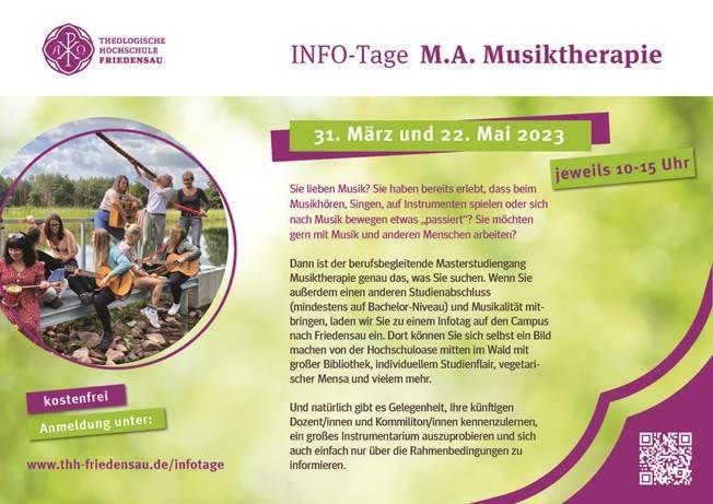 Die diesjährigen Info-Tage zum Masterstudiengang Musiktherapie finden am Freitag, den 31. März 2023, und Montag, den 22. Mai 2023, statt. Dazu laden die Lehrenden am Master-Studiengang Musiktherapie jeweils von 10.00 bis 15.00 Uhr auf den Hochschulcampus ein. Die Teilnahme ist kostenfrei und unverbindlich. Aufgrund begrenzter Kapazitäten im musiktherapeutischen Kabinett ist dennoch eine Anmeldung erforderlich: https://www.thh-friedensau.de/infotage.…Continue reading Einladung zu Info-Tagen „Musiktherapie“ nach Friedensau (Seminar | Möckern)