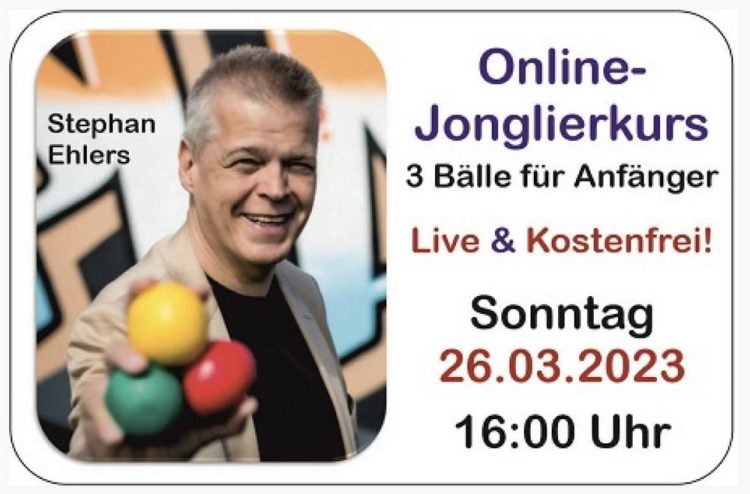 Lernen Sie in verblüffend kurzer Zeit das Jonglieren mit 3 Bällen … bei Deutschlands erfolgreichstem Jongliertrainer. Nach dem Kurs kann man allein weiterüben… dazu gibt es hinterher für alle Teilnehmer Hinweise und Links zu kostenfreien Video-Tools und Lern-Apps. Die Teilnahme an diesem Online-Workshop ist KOSTENFREI!