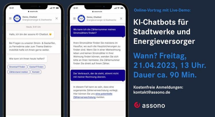 Am 21. April um 13 Uhr haben wir einen Online-Austausch zum Thema „Nutzen von KI-Chatbots für Stadtwerke und Energieversorger“ geplant. In dem kostenlosen Zoom-Meeting sprechen unsere Chatbot-Experten mit Ihnen über die Vorteile eines KI-Chatbots für Stadtwerke und Energieversorger, teilen Erfahrungswerte aus der Praxis und zeigen Ihnen eine Live-Demo. „Wie setzen sich die Energiepreise zusammen? Wie…Continue reading Online-Vortrag: Nutzen von KI-Chatbots für Stadtwerke und Energieversorger (Vortrag | Online)