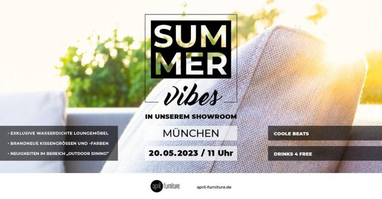 Wir begrüßen Sie in unserem Showroom in München und laden Sie ein, uns und unsere Produkte kennenzulernen. Neben unseren Loungemöbeln stellen wir Ihnen unsere neuen Kissengrößen sowie brandneue Dining-Möbel vor. Nehmen Sie Platz, genießen Sie ein Getränk und haben Sie eine gute Zeit. Wir freuen uns auf Sie! Eventdatum: Samstag, 20. Mai 2023 11:00 –…Continue reading Summer vibes in unserem Showroom MÜNCHEN (Ausstellung | München)
