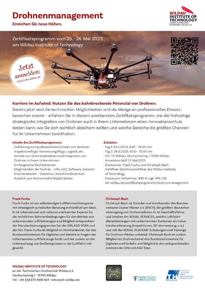 Noch bis zum 12. Mai 2023 könnt Ihr Euch für den vom Wildau Institut of Technology in Kooperation mit dem Bundesverband Copter Piloten e.V. angebotenen zweitägigem Seminar Zertifikatsprogramm Drohnenmanagement anmelden!