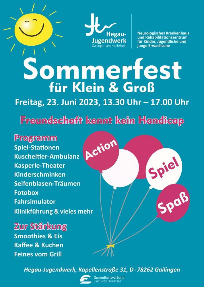 Sommerfest des Hegau-Jugendwerks Unter dem Motto „Freundschaft kennt kein Handicap“, möchten wir gemeinsam mit unseren Patienten und ihren Angehörigen, Freunden und Förderern, externen Besuchern und allen, die das Hegau-Jugendwerk gerne näher kennenlernen möchten ein schönes Sommerfest feiern. Unsere kleinen und großen Besucher erwartet ein kunterbuntes Rahmenprogramm mit Kasperletheater, Kinderschminken, Seifenblasen-Träumen, Fahrsimulator, der kaufBar mit einzigartigen…Continue reading Sommerfest Hegau-Jugendwerk „Freundschaft kennt kein Handicap“ (Unterhaltung / Freizeit | Gailingen am Hochrhein)