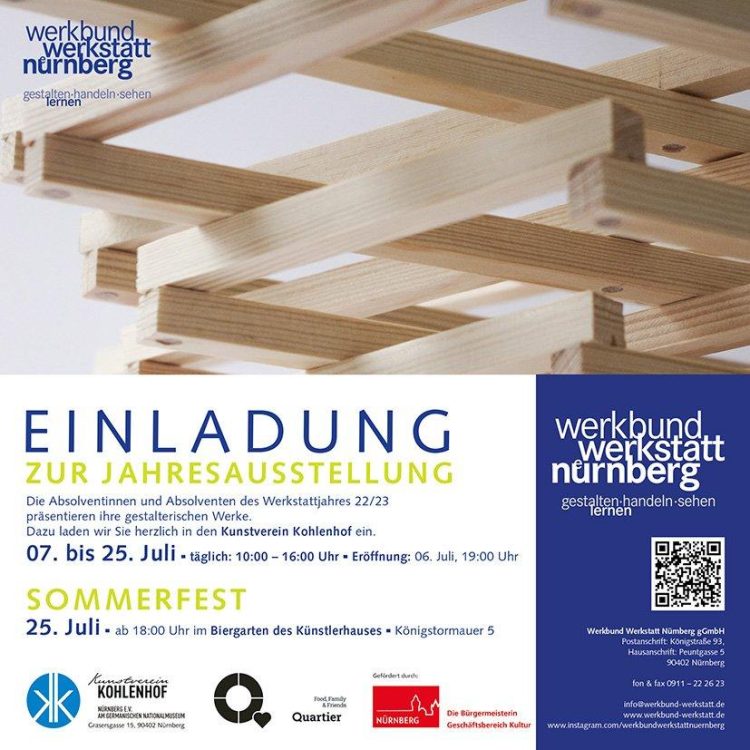 Vom 07.–25.07.2023 zeigen die Teilnehmenden des aktuellen Werkstattjahres die Arbeiten aus den Werkstätten Glas, Holz, Metall, Textil und Gestaltung sowie weiterer Unterrichtsbereiche wie z. B. Modellbau und Aktzeichnen. Die Ausstellung wird am Donnerstag, 06.07.2023 um 19:00 Uhr im Kunstverein Kohlenhof, Grasersgasse 15, 90402 Nürnberg durch den Schulleiter Norbert Zlöbl, mit einer kleinen Feier im Anschluss,…Continue reading Abschlussausstellung der Werkbund Werkstatt Nürnberg (Ausstellung | Nürnberg)