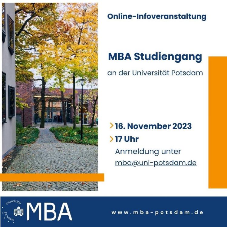 Am Donnerstag, den 16. November 2023 findet um 17 Uhr eine Online-Infoveranstaltung zum Studiengang Master of Business Administration (MBA) an der Universität Potsdam statt. Die Studiengangleiterin, Frau Dr. Roya Madani, gibt Ihnen einen Überblick über den Inhalt und die Organisation des berufsbegleitenden Studiengangs und steht anschließend zur Beantwortung Ihrer Fragen zur Verfügung. Interessenten erhalten auf…Continue reading Online-Infoveranstaltung zum Master of Business Administration (MBA) an der Universität Potsdam (Webinar | Online)