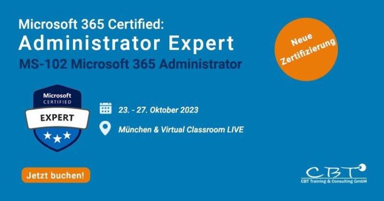 Der Kurs MS-102 Microsoft 365 Administrator beinhaltet die Schlüsselelemente der Microsoft 365-Verwaltung. Microsoft 365 Mandantenverwaltung, Identitätssynchronisation sowie Sicherheit und Compliance in Microsoft 365 sind Schwerpunkte des neuen Kurses. Dieses Training bildet die Grundlage für die neue Zertifizierung „Microsoft 365 Certified: Administrator Expert“, die Sie mit Bestehen der Prüfung MS-102 erlangen. Eventdatum: 23.10.23 – 27.10.23 Eventort:…Continue reading Microsoft MS-102 – Jetzt anmelden und Platz sichern! (Seminar | München)