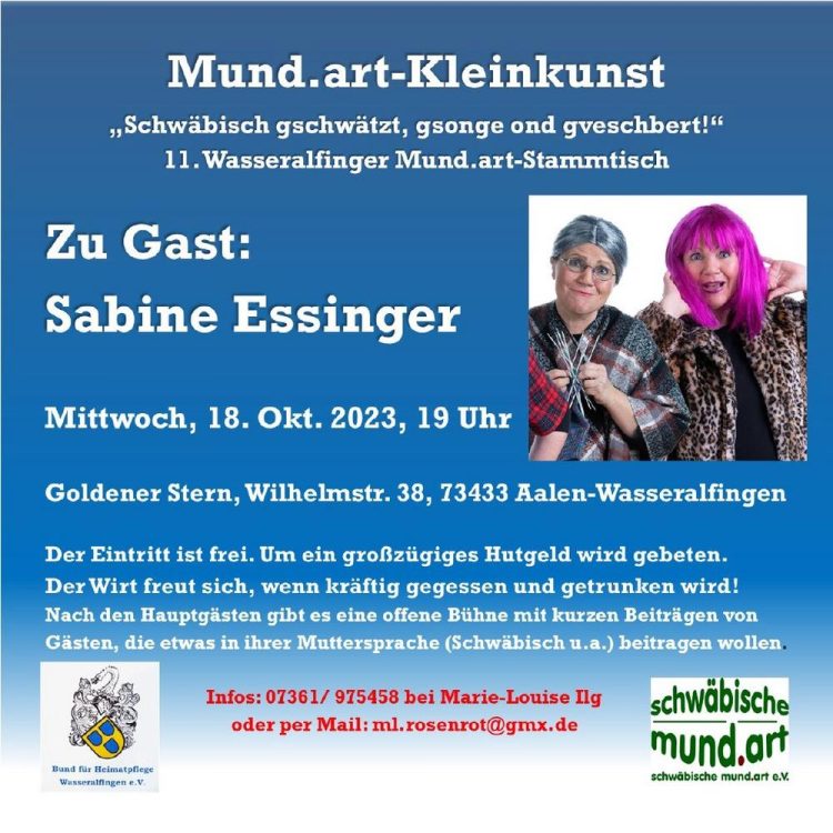 Mund.art-Kleinkunst„Schwäbisch gschwätzt, gsonge ond gveschbert!“ 11. Wasseralfinger Mund.art-Stammtisch Zu Gast: Sabine Essinger Mittwoch, 18. Okt. 2023, 19 Uhr Goldener Stern, Wilhelmstr. 38, 73433 Aalen-Wasseralfingen Der Eintritt ist frei. Um ein großzügiges Hutgeld wird gebeten. Der Wirt freut sich, wenn kräftig gegessen und getrunken wird!Nach den Hauptgästen gibt es eine offene Bühne mit kurzen Beiträgen von…Continue reading Sabine Essinger im Goldenen Stern (Unterhaltung / Freizeit | Aalen)