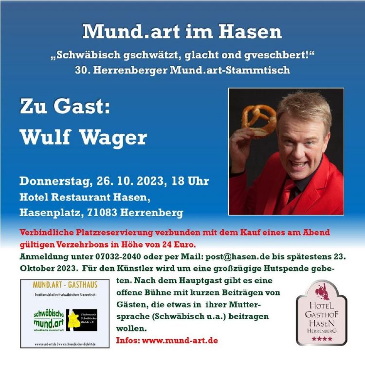 „Schwäbisch gschwätzt, glacht ond gveschbert!“30. Herrenberger Mund.art-StammtischZu Gast: Wulf WagerDonnerstag, 26. 10. 2023, 18 UhrHotel Restaurant Hasen,Hasenplatz, 71083 HerrenbergVerbindliche Platzreservierung verbunden mit dem Kauf eines am Abend gültigen Verzehrbons in Höhe von 24 Euro.Anmeldung unter 07032-2040 oder per Mail: post@hasen.de bis spätestens 23. Oktober 2023. Für den Künstler wird um eine großzügige Hutspende gebe-ten. Nach…Continue reading Wulf Wager spielt bei Mund.art im Hasen (Unterhaltung / Freizeit | Herrenberg)