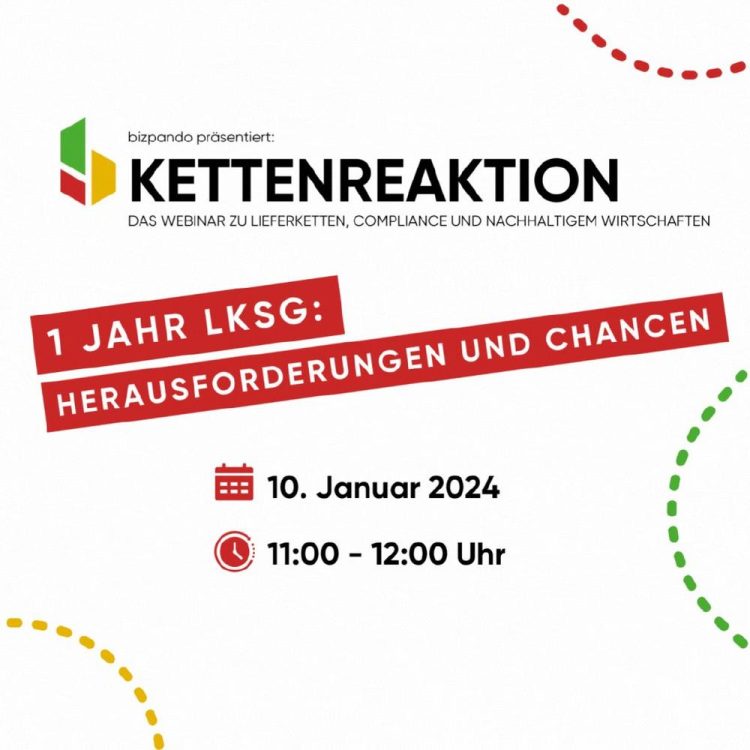 Am 10. Januar um 11 Uhr geht die Kettenreaktion in die nächste Runde! Zum einjährigen Jubiläum des LkSG sprechen wir in der kommenden Webinar-Ausgabe über Herausforderungen und Chancen, die das Gesetz mit sich bringt.