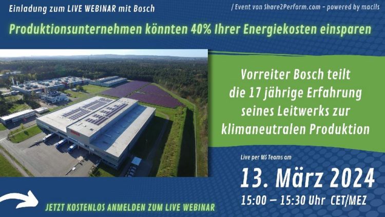 Energiekosten sind heute ein wichtiger Standortfaktor. Bereits vor 17 Jahren hat Bosch in seinem Leitwerk für die klimaneutrale Produktion in Homburg begonnen, eine Vielzahl übertragbarer Ansätze zur Verbesserung der Energieeffizienz zu entwickeln und umzusetzen. Die Maßnahmen reichen dabei von A wie Abschaltmanagement bis Z wie Zustandsorientierte Wartung. Auf diese Weise konnte der Energieeinsatz pro produziertem…Continue reading Kostenloses Webinar: Produktionsunternehmen könnten 40% Ihrer Energiekosten einsparen (Webinar | Online)
