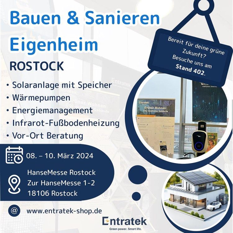 Besuch uns auf der Eigenheim Messe in Rostock. Unsere Berater zeigen dir, wie du dein Eigenheim energieeffizienter machen und eigenen Strom erzeugen kannst. Erfahre mehr über unser breites Portfolio, darunter: Solaranlage mit Speicher Wärmepumpen Energiemanagement Wallbox für E-Fahrzeug (zum PV-Laden) Infrarot-Fußbodenheizung Klimaanlagen Balkonkraftwerk mit Speicher Vereinbare jetzt einen Termin, um uns auf der Messe zu…Continue reading Entratek auf der Messe Bauen & Sanieren Eigenheim Rostock (Messe | Rostock)