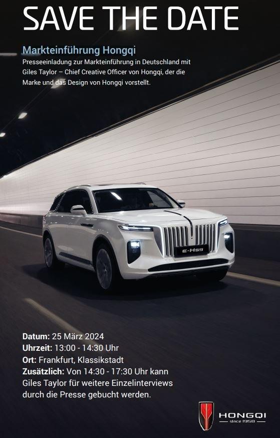 Sehr geehrte Pressevertreterinnen,Sehr geehrte Pressevertreter, wir möchten Sie herzlich zur offiziellen Markteinführung der Marke Hongqi einladen: Montag, 25.03.2024Klassikstadt FrankfurtOrber Str. 4a · 60386 Frankfurt am Main Weitere Informationen zur Marke werden wir ab dem 25.03.2024 kommunizieren. Wir freuen uns über Ihre Rückmeldung bis zum 18.03.2024 unter: jessica.hill@torpedo-gruppe.de Eventdatum: Montag, 25. März 2024 13:00 – 14:30…Continue reading Markteinführung Hongqi (Sonstiges | Frankfurt am Main)