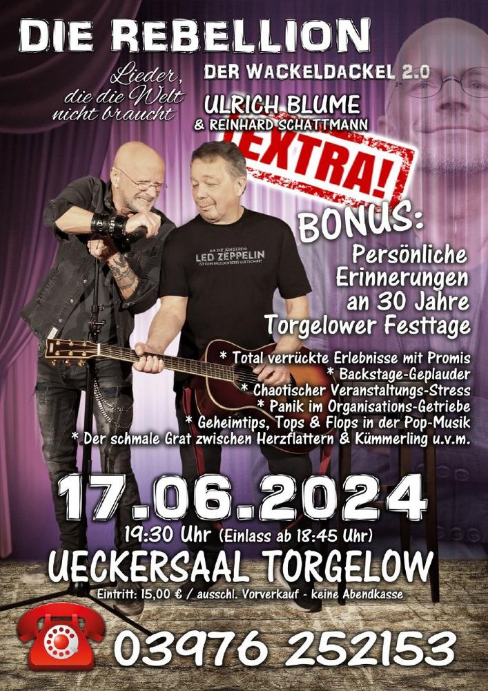 „Lieder, die die Welt nicht braucht.“ – Ulrich Blume und Reinhard Schattmann führen im Rahmen der 60. Torgelower Festtage ihr beliebtes Bühnenprogramm im Ueckersaal Torgelow auf. Dazu als Bonus: Persönliche Erinnerungen an 30 Jahre Torgelower Festtage – Ulli Blume erzählt über seine spannendsten Erfahrungen. Tickets können ausschließlich im Vorverkauf im Rathaus in Torgelow erworben werden.…Continue reading Die Rebellion der Wackeldackel 2.0. – Ulrich Blume & Reinhard Schattmann (Unterhaltung / Freizeit | Torgelow)
