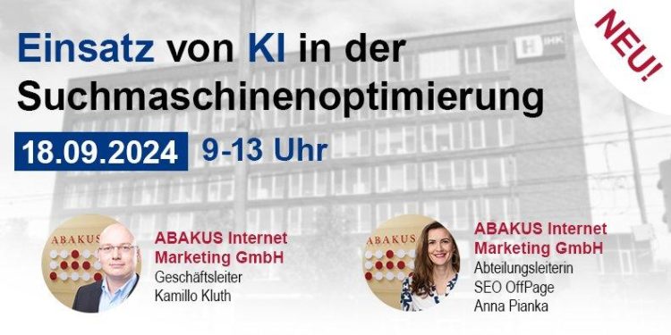 In Kooperation mit der Industrie- und Handelskammer (IHK) Hannover bietet die ABAKUS Internet Marketing GmbH am 18. September 2024 ein neues Seminar rund um das Thema „Einsatz von KI in der Suchmaschinenoptimierung (SEO)“ an. Neben den drei etablierten Veranstaltungen, die ABAKUS-Referenten bereits seit vielen Jahren an der IHK Hannover anbieten, beschäftigt sich dieses neue Seminar…Continue reading Einsatz von KI in der Suchmaschinenoptimierung (SEO) (Seminar | Hannover)