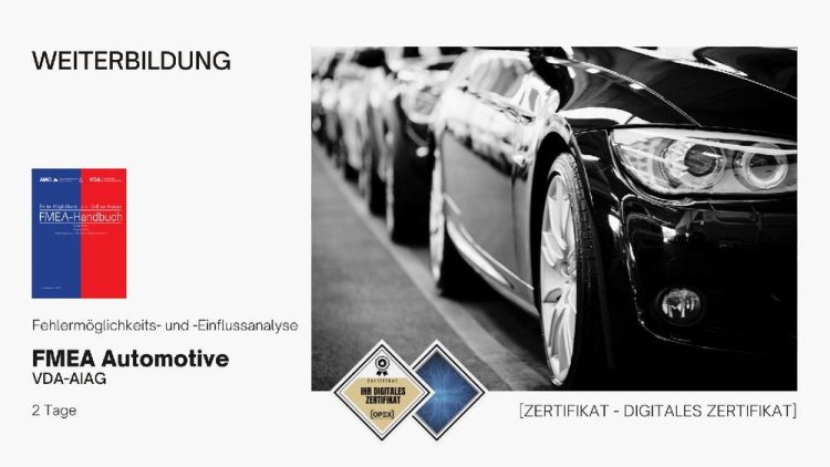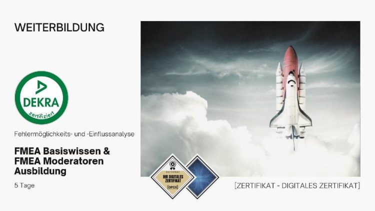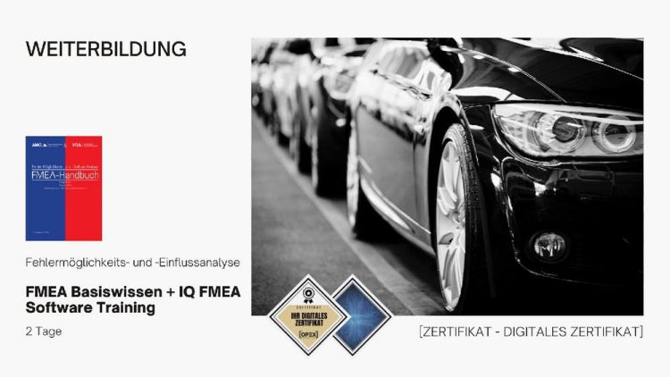 Das FMEA Basiswissen (2 Tage) bietet einen umfassenden Überblick über die Anwendungsbereiche und die Einbettung der FMEA Methode in Qualitätsstrategien. Erweiterte Arbeitsweisen sowie die Unterscheidung in System-, Konstruktions- und Prozess-FMEA werden dabei detailliert thematisiert. Wichtige Kernelemente des Seminars bilden dabei die VDA-konforme Anwendung der 7 Schritte der FMEA sowie eine ausführliche Betrachtung und Interpretation von…Continue reading FMEA Grundlagen Schulung | FMEA Basiswissen (2 Tage) (Seminar | Stuttgart)
