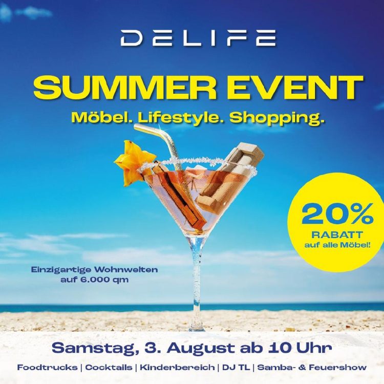 Endlich ist es wieder soweit! Nach dem riesigen Erfolg des DELIFE Summer Events 2022 mit über 2.000 begeisterten Gästen lädt am 3. August eines der bekanntesten Möbelunternehmen der Region ein, entspannten Lifestyle in Oberfranken mit Foodtrucks, Cocktails, Chillout-Lounge und vielem, vielem mehr zu erleben. Ab 10 Uhr erwartet die Besucher auf dem weiträumigen Firmengelände ein…Continue reading DELIFE SUMMER EventMöbel. Lifestyle. Shopping (Unterhaltung / Freizeit | Ebersdorf bei Coburg)