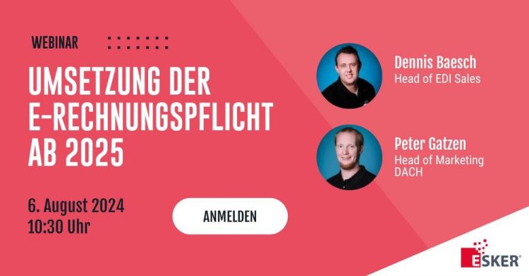 Ab 1. Januar 2025 greifen die ersten Verpflichtungen zur elektronischen Rechnungsstellung im B2B-Sektor in Deutschland. Ab diesem Zeitpunkt müssen alle Unternehmen in der Lage sein, strukturierte, elektronische Rechnungen zu empfangen. In unserem Webinar am 6. August zeigen Dennis Baesch und Peter Gatzen den aktuellen Stand zu den gesetzlichen Regelungen und wie diese mit Esker EDI Services umgesetzt werden können.
