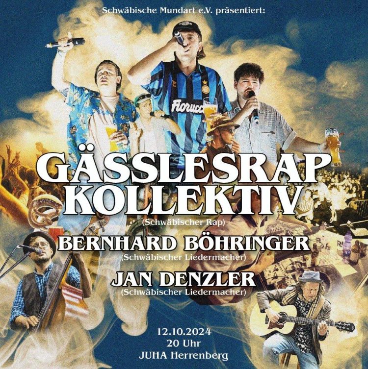 Mit der seltenen Kombination von kraftvoll-leidenschaftlichem schwäbischem Rap des Gässlesrap Kollektivs und der lässig-ironischen Liedermacherei der beiden Mund.art-Singer-Songwriter Bernhard Böhringer und Jan Denzler erwartet das Publikum am Samstag, 12. Oktober um 20 Uhr im Jugendhaus Herrenberg ein höchst abwechslungsreiches musikalisches Programm voller Lebensfreude, Geist, Humor und Wortwitz – alles auf Schwäbisch!
