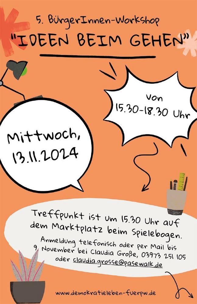 Treffpunkt ist um 15:30 Uhr auf dem Marktplatz beim Spielebogen. Anmeldung telefonisch oder per Mail bis zum 09.11.2024 bei Claudia Große: Tel.: 03973 251-105, E-Mail: ed.klawesap@essorg.aidualc. Eventdatum: Mittwoch, 13. November 2024 15:30 – 18:30 Eventort: Pasewalk Firmenkontakt und Herausgeber der Eventbeschreibung: Stadt PasewalkAm Markt 1217309 PasewalkTelefon: +49 (3973) 2510Telefax: +49 (3973) 251287http://www.pasewalk.de Weiterführende Links Zum Event…Continue reading 5. BürgerInnen-Workshop “IDEEN BEIM GEHEN” (Unterhaltung / Freizeit | Pasewalk)