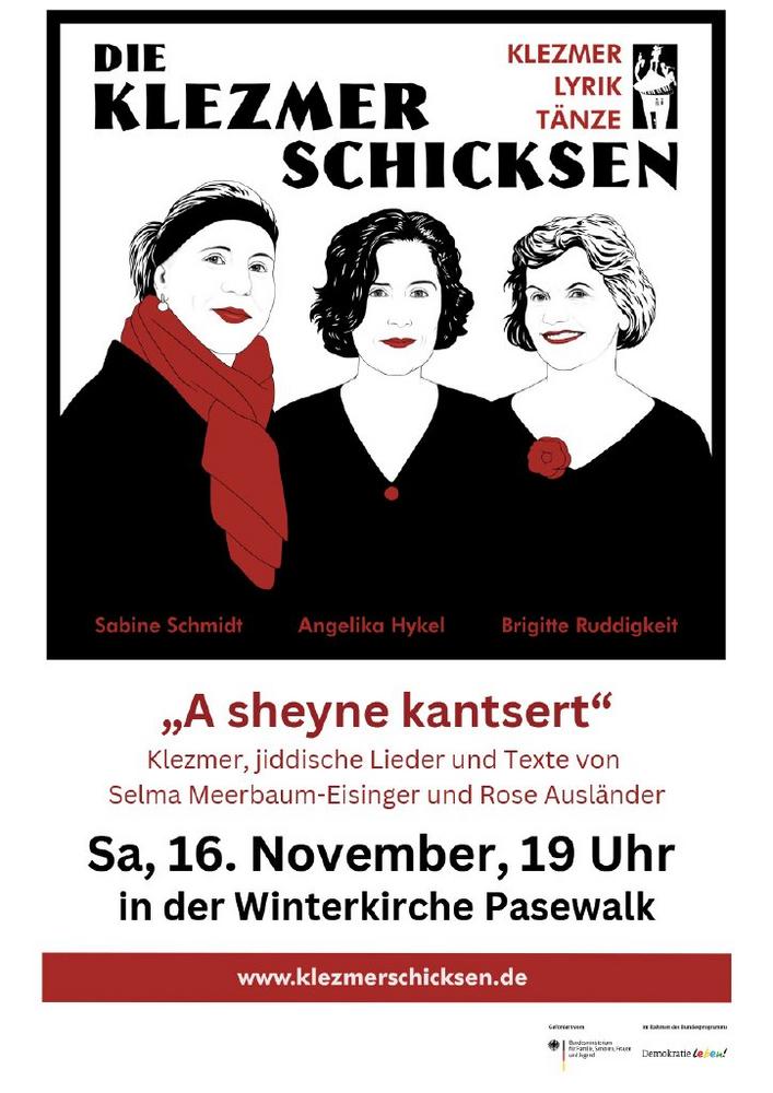 Winterkirche St. Marien Pasewalk „A sheyne kantsert“ Klezmer, jiddische Lieder und Texte von Selma Meerbaum-Eisinger und Rose Ausländer Eventdatum: Samstag, 16. November 2024 19:00 – 23:59 Eventort: Pasewalk Firmenkontakt und Herausgeber der Eventbeschreibung: Stadt PasewalkAm Markt 1217309 PasewalkTelefon: +49 (3973) 2510Telefax: +49 (3973) 251287http://www.pasewalk.de Weiterführende Links Zum Event Originalinserat von Stadt Pasewalk Alle Events von…Continue reading Die Klezmer Schicksen (Unterhaltung / Freizeit | Pasewalk)