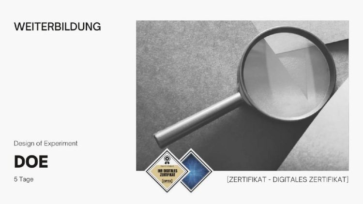 - Zudem ist DoE das einzige Verfahren, um zielgerichtet ein Optimum im System (Materialeigenschaften, Produktionsprozess, Ausbeute, Kosten, etc.) zu finden.