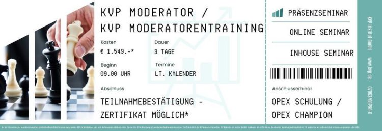Das Seminar richtet sich an alle Mitarbeiter, die sich als zukünftige Moderatoren qualifizieren wollen und an der Leitung von KVP Teamsitzungen und KVP Workshops teilhaben möchten sowie an alle Führungskräfte. Als zukünftiger KVP Moderator sind Sie in der Lage KVP-Teamsitzungen effizient und praxisnah zu moderieren und damit wertvolle Ressourcen optimal zu nutzen. In der Rolle als aktiver und passiver Moderator werden Sie in die Lage versetzt, die Mitarbeiter zur nachhaltigen Umsetzung zu motivieren. Für die Teilnahme an der KVP Moderatorenausbildung sind KVP Grundkenntnisse und/oder Erfahrungen als Teammitglied in KVP Projekten notwendig.