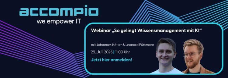 Dienstag, 29.07.2025 – 11.00 UhrReferenten: Johannes Hötter & Leonard Püttman Tausende Dokumente warten in Ordnern – doch echtes Wissen entsteht erst, wenn Mitarbeitende die richtige Info in Sekunden finden. Generative KI macht genau das möglich: Sie hebt Wissensschätze, beantwortet Fragen im Kontext und entlastet Teams spürbar. Darum geht’s in 45 Minuten: Potenzial entdecken – Wie…Continue reading Webinar: So gelingt Wissensmanagement mit KI (Webinar | Online)