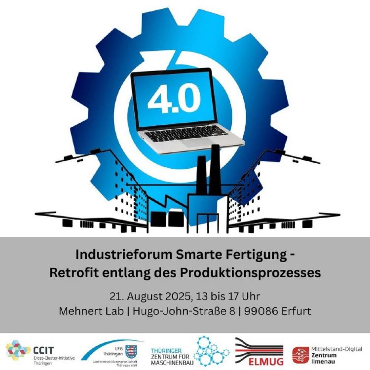 Wie kann die bestehende Produktion durch gezieltes Retrofitting effizient, sicher und zukunftsfähig modernisiert werden? Antworten auf diese Frage liefert das Industrieforum „Smarte Fertigung – Retrofit entlang des Produktionsprozesses“, das am 21. August 2025 von 13:00 bis 17:00 Uhr im Mehnert Lab (Hugo-John-Straße 8, 99086 Erfurt) stattfindet. In kompakten Vorträgen und praxisnahen Demonstrationen erhalten Fach- und Führungskräfte wertvolle Impulse…Continue reading Einladung zum Industrieforum „Smarte Fertigung – Retrofit entlang des Produktionsprozesses“ am 21. A (Konferenz | Erfurt)