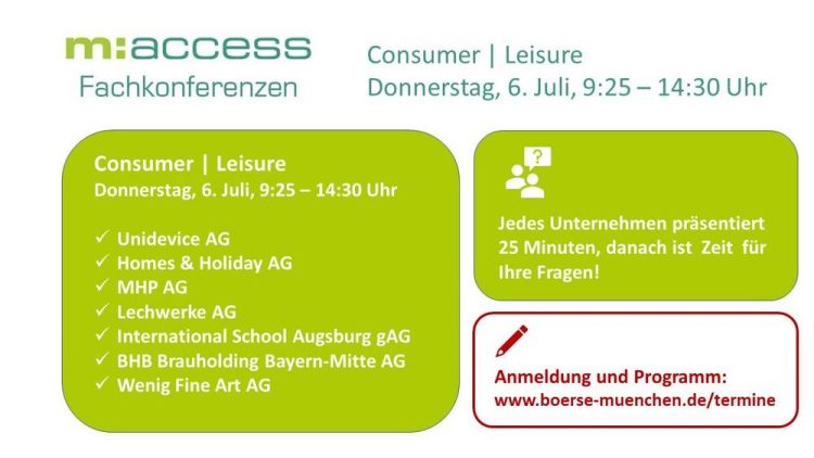 Die Fachkonferenz Consumer/Leisure unsres Mittelstandssegment m:access findet wieder in Hybrider Form statt. Instutionelle Investoren, Analysten und Journalisten sind in den Räumen der Börse München herzlich willkommen, Privatanleger und Interessierte können gerne online kostenlos teilnehmen. Es präsentieren die Unternehmen Unidevice AG Homes & Holiday AG MHP AG Lechwerke AG ISA International School Augsburg gAG BHB Brauholding…Continue reading Fachkonferenz Consumer/Leisure (Webinar | Online)