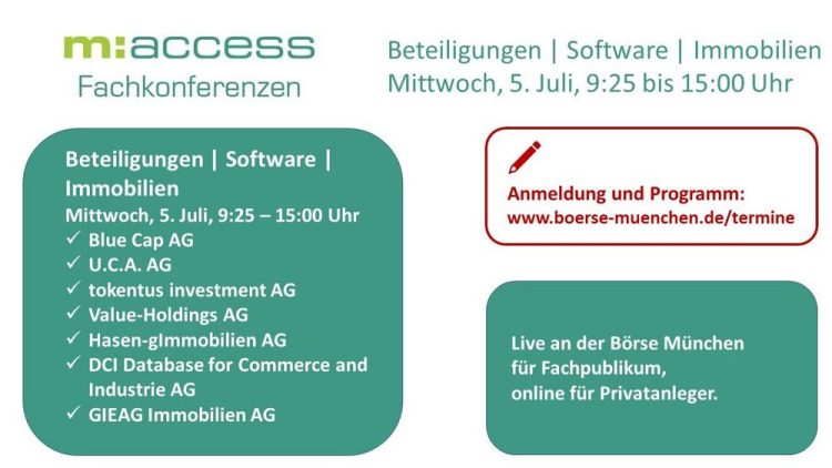 Die Fachkonferenz Beteiligungen/Softwarte/Immobilien findet hybrid statt. Institutionelle Investoren, Analysten und Journalisten sind herzlich in den Räumen der Börse München am Karolinenplatz nach Anmeldung willkommen. Privatanleger und Interessierte können kostenlos online teilnehmen. Es präsentieren die Unternehmen Blue Cap AG U.C.A. AG tokentus investment AG Value-Hodlings- AG Hasen-Immobilien AG DCI AG GIEAG Immobilien AG Die Unternehmen präsentieren…Continue reading Fachkonferenz mit Schwerpunkt Beteiligungsunternehmen (Webinar | Online)