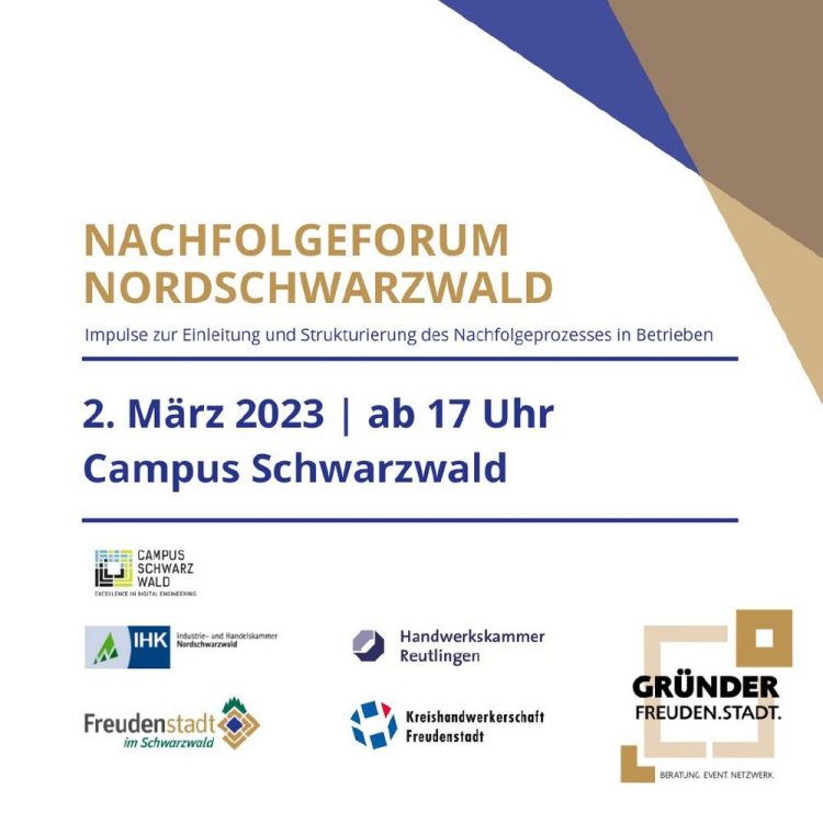 Unter dem Motto “Wie kann ich meine Unternehmensnachfolge in herausfordernden Zeiten gestalten” rufen die Handwerkskammer Reutlingen, die Wirtschaftsförderung der Stadt Freudenstadt, der Campus Schwarzwald und die Industrie- und Handelskammer Nordschwarzwald gemeinsam zum zweiten Mal dieses Veranstaltungsformat ins Leben. Es wird in Präsenz stattfinden. An diesem Nachmittag werden Ihnen wichtige Impulse zur Einleitung und Strukturierung Ihres Nachfolgeprozesses…Continue reading Nachfolgeforum Nordschwarzwald (Vortrag | Freudenstadt)