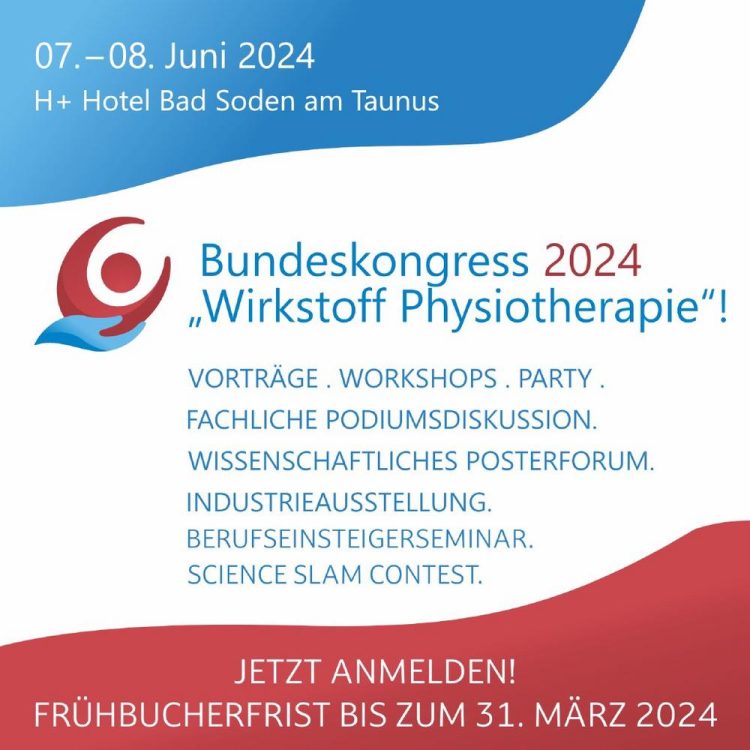 „Wirkstoff Physiotherapie“ lautet unser Kongressmotto in diesem Jahr. Dieses Motto haben wir ganz bewusst gewählt. Denn: Der Bundeskongress Physiotherapie 2024 ist ein ganz besonderer Kongress. 2024 feiert PHYSIO-DEUTSCHLAND 75-jähriges Verbandsjubiläum – 75 Jahre Engagement für die berufspolitische und – in ganz besonderem Maß – für die fachliche Weiterentwicklung der Physiotherapie in Deutschland und als Gründungsmitglied…Continue reading Bundeskongress 2024 (Kongress | Bad Soden am Taunus)
