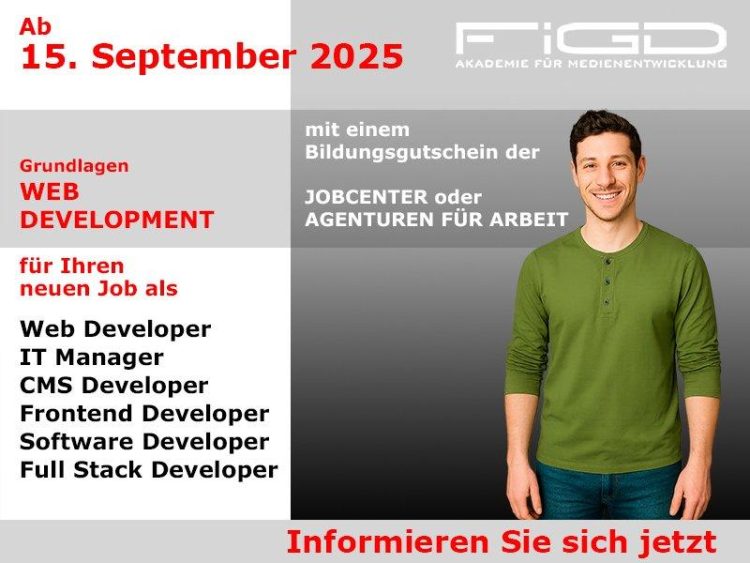Die Weiterbildung „Grundlagen Internetprogrammierung“ der FiGD Akademie GmbH bietet ab dem 15. September 2025 eine fundierte Möglichkeit, sich ortsunabhängig und digital im Bereich Webentwicklung zu qualifizieren. Teilnehmende lernen im virtuellen Klassenzimmer in Echtzeit mit erfahrenen Dozenten – live, interaktiv und mit direkter Betreuung. Der Unterricht findet montags bis freitags von 08:30 bis 15:30 Uhr statt…Continue reading Zukunftskompetenz Webentwicklung – beruflich durchstarten mit Bildungsgutschein (Schulung | Online)