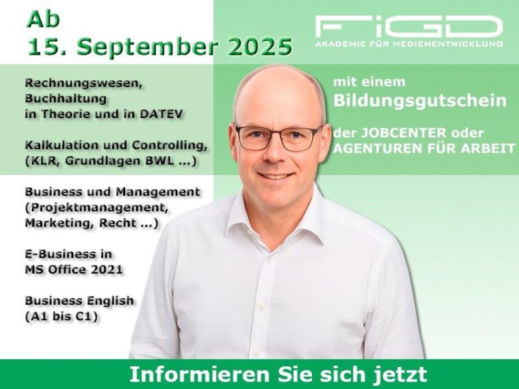 Die FiGD Akademie Berlin bietet ab dem 15. September 2025 eine Online-Weiterbildung in Rechnungswesen, Buchhaltung & Controlling an. Der Kurs läuft bis zum 21. November 2025 in Vollzeit (Montag bis Freitag, 08:30 – 15:30 Uhr) und ist zu 100 % mit einem Bildungsgutschein der Agentur für Arbeit oder des Jobcenters förderbar. Inhalte der Online-Weiterbildung Im…Continue reading Online-Weiterbildung Rechnungswesen & Buchhaltung – Start 15.09.2025 | FiGD Akademie (Schulung | Online)