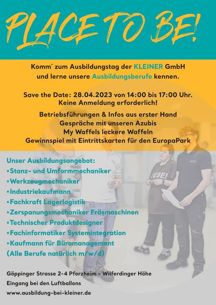 Am 28. April findet von 14:00 bis 17:00 Uhr unser Ausbildungstag in unserem Hause (Göppinger Straße 2-4, 75179 Pforzheim) statt. Dabei kannst du KLEINER interaktiv erleben: Ob bei einer Führung durch das Haus oder durch Infos aus erster Hand von unseren Azubis und unserem Ausbildungsteam. Zusätzlich gibt es ein Gewinnspiel für Eintrittskarten in den Europa…Continue reading TAG DER AUSBILDUNG BEI DER KLEINER GMBH (Messe | Pforzheim)