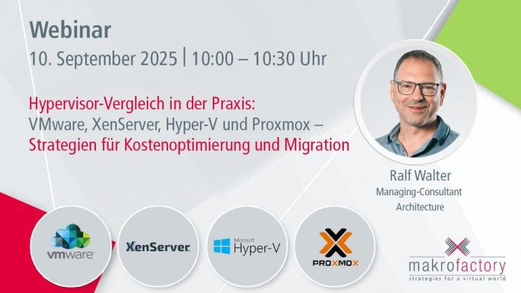 Wissen Sie, welche Virtualisierungslösung am Besten zu Ihrem Unternehmen passt? In unserem kompakten Praxis-Webinar vergleichen wir VMware, XenServer, Hyper-V und Proxmox direkt – mit Fokus auf Kostenoptimierung und Migration. Verpassen Sie nicht die Gelegenheit, sich über die unterschiedlichen Virtualisierungsplattformen zu informieren, um eine fundierte Entscheidung für Ihr Unternehmen treffen zu können. Was Sie erwartet: Aktuelle…Continue reading Hypervisor-Vergleich in der Praxis: VMware, XenServer, Hyper-V und Proxmox (Webinar | Online)