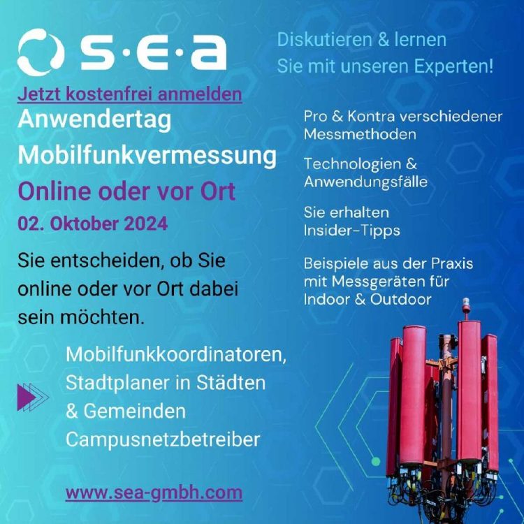 Wir laden Sie herzlich zu unserem Online oder Präsenz Anwendertag Mobilfunkvermessung 2024 ein.Diese Veranstaltung ist kostenlos und richtet sich an Mobilfunkkoordinatoren, Stadtplaner in Städten und Gemeinden und Campusnetzbetreiber. Unser Mobilfunkmesstag wird sowohl als Präsenzveranstaltung als auch als Online-Veranstaltung angeboten. Grundkenntnisse im Bereich Mobilfunk sind nicht erforderlich. Perfektionieren Sie Ihr Wissen! Wie funktioniert das klassische Mobilfunknetz…Continue reading Online Anwendertag Mobilfunkvermessung 2024 – Praxisorientiertes Expertenwissen (Seminar | Online)