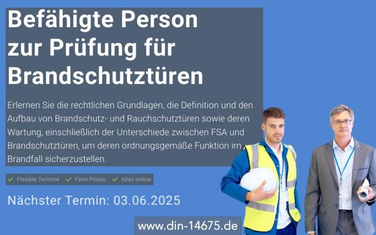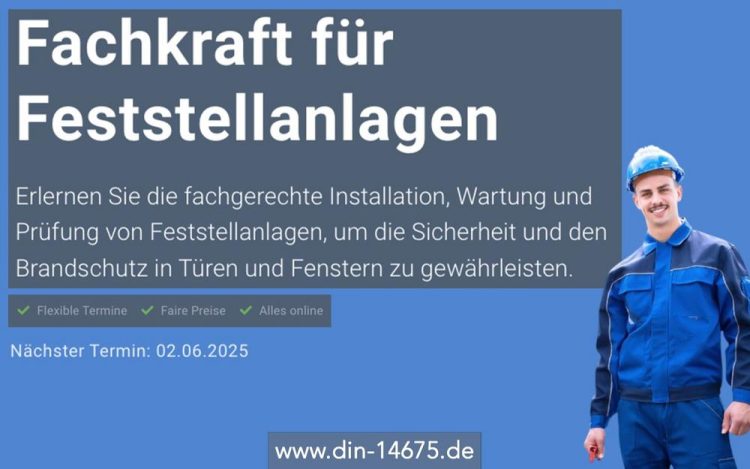 Diese zweitägige Onlineschulung vermittelt das notwendige Wissen zu Feststellanlagen: von rechtlichen Grundlagen und Normen wie DIN EN 14637 und DIN 14677 bis zu den Anforderungen der DiBt-Richtlinie. Behandelt werden zudem Funktion, Bestandteile sowie Feuer- und Rauchschutzabschlüsse, inklusive Pflichten und Verantwortlichkeiten. Fehler bei der Planung, dem Betrieb oder der Wartung von Feststellanlagen können schwerwiegende Folgen haben,…Continue reading Fachkraft Feststellanlagen mit Prüfung (Schulung | Online)