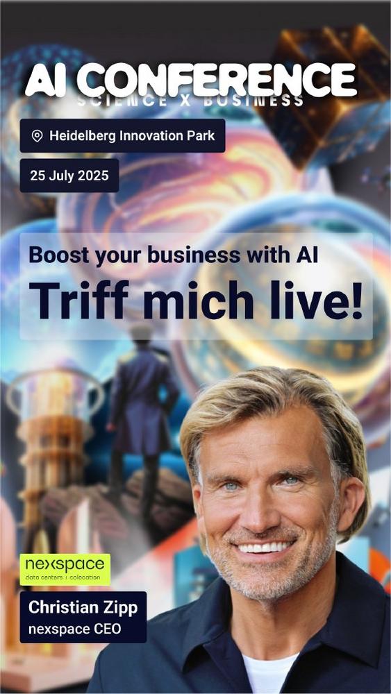 AI Business Conference @hip | Heidelberg Innovation Park (Palo-Alto-Platz, 69124 Heidelberg) nexspace ist Platinum-Sponsor der AI Business Conference! Wir von nexspace data centers | colocation sind stolz, als Platinum-Sponsor bei der AI Business Conference in Heidelberg am 25.07.25 dabei zu sein! Mit über 30 Jahren Erfahrung und dem Fokus auf sichere, nachhaltige IT-Infrastrukturen unterstützen wir…Continue reading AI Conference, Messe & Festival für KMU – Heidelberg Innovation Park (hip) (Kongress | Heidelberg)