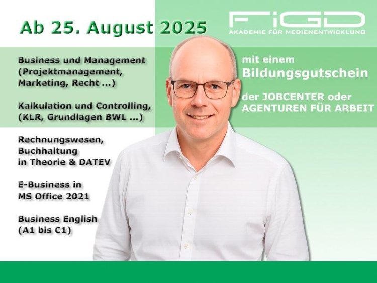 Kalkulation ist mehr als Rechnen – sie ist der Schlüssel zur wirtschaftlichen Planung, Steuerung und Bewertung betrieblicher Prozesse. Das Lernmodul „Kalkulation“ der FiGD Akademie vermittelt Ihnen in einem kompakten Onlinekurs alle Grundlagen der Kostenrechnung, IT-gestützten Budgetierung und des Controllings – praxisnah, verständlich und zu 100 % förderfähig mit Bildungsgutschein. Ab dem 24. November 2025 nehmen Sie…Continue reading Mit Online-Weiterbildung ins internationale Berufsleben – Englischkompetenz aus dem Homeoffice (Schulung | Online)