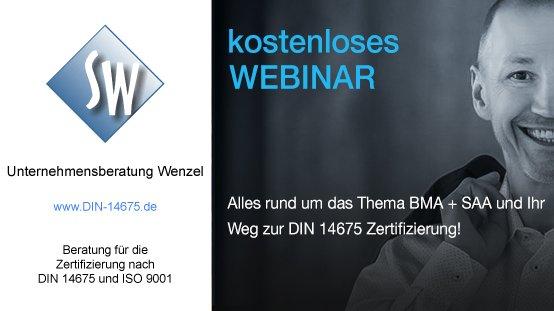 Kostenloses Webinar! In unserem kostenlosen Webinar erklärt Ihnen Dipl.-Ing. Stephan Wenzel, Geschäftsführer der Unternehmensberatung Wenzel, welcher Weg zur DIN 14675 der für Sie schnellste und leichteste ist. Nehmen Sie sich lediglich 60 Minuten Zeit, um kompakt und effektiv über die DIN 14675 informiert zu werden. Dabei ist es egal, ob Sie ein 1-Mann-Betrieb sind oder bis…Continue reading Alles rund um das Thema BMA + SAA und Ihr Weg zur DIN 14675 Zertifizierung! (Webinar | Online)
