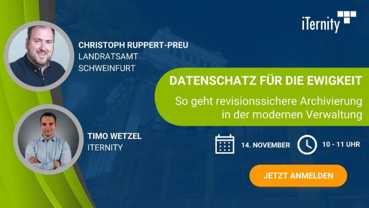 Aus der Praxis für die Praxis – Exklusiv-Interview mit dem Landratsamt Schweinfurt und iTernity! Christoph Ruppert-Preu, Stabsstelle Personal und Zentraler Service bei unserem Kunden Landratsamt Schweinfurt und Timo Wetzel von iTernity sprechen über die Herausforderungen und Lösungsansätze bei der revisionssicheren Archivierung. Die Session verspricht viele spannende Insider-Einblicke und zeigt, wie die Behörde die revisionssichere Archivierung…Continue reading Datenschatz für die Ewigkeit: So geht revisionssichere Archivierung in der modernen Verwaltung (Webinar | Online)