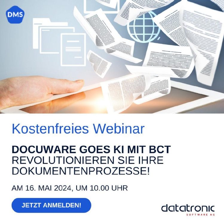 Kämpfen auch Sie mit manuellen Prozessen in Ihrem Unternehmen, die kostbare Zeit verschlingen und Raum für Fehler lassen? Trotz des digitalen Zeitalters sind viele Unternehmen noch immer von ineffizienten Abläufen betroffen, die den Arbeitsalltag belasten. In unserem kostenfreien Webinar „DocuWare goes KI mit BCT“ möchten wir Ihnen eine Lösung vorstellen. Erfahren Sie, wie DocuWare und…Continue reading DocuWare goes KI mit BCT – Revolutionieren Sie Ihre Dokumentenprozesse! (Webinar | Online)
