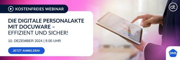 Die Digitalisierung von Personaldokumenten bringt viele Vorteile, ist jedoch für viele Unternehmen eine echte Herausforderung. Mit DocuWare, der modernen Lösung für Dokumentenmanagement, können Sie Personalakten sicher digitalisieren, verwalten und Compliance-Vorgaben erfüllen – und so die Effizienz Ihrer Prozesse erheblich steigern. Erfahren Sie in unserem kostenfreien Webinar am 10.12.2024 um 9 Uhr, wie Sie die Digitale…Continue reading Die Digitale Personalakte mit DocuWare – Effizient und sicher! (Webinar | Online)
