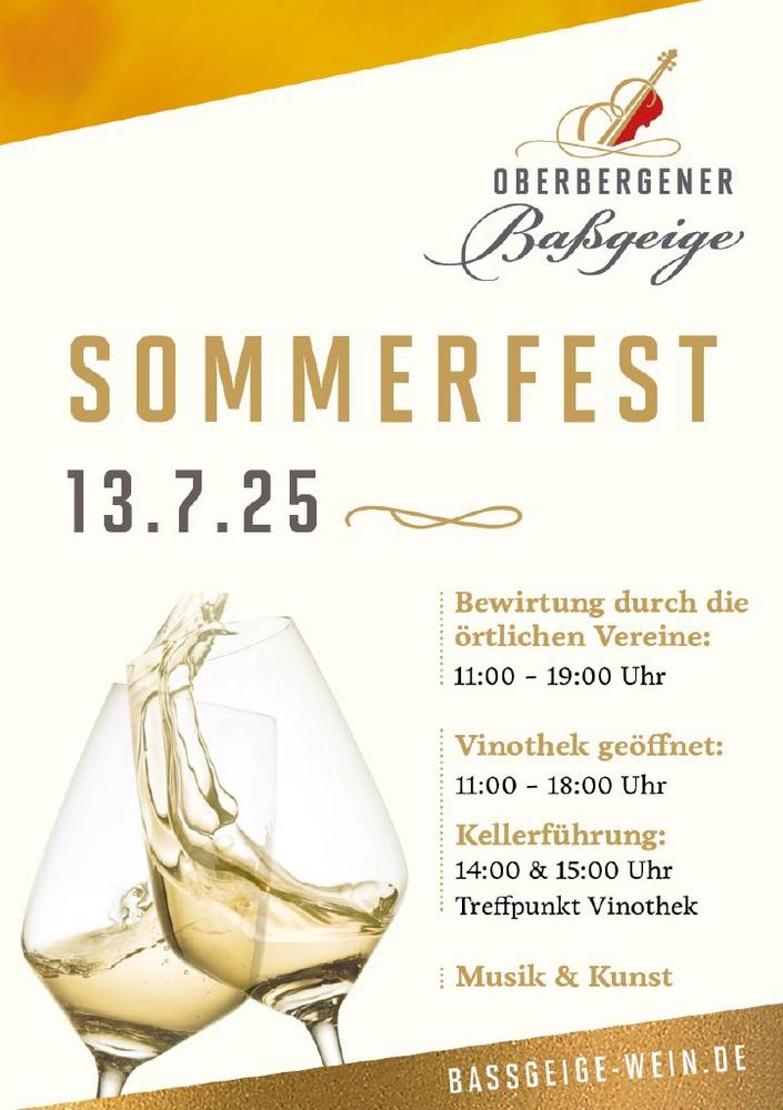 Bewirtung durch die örtlichen Vereine mit regionalen Speisen sowie unseren Wein- und Sektspezialitäten, mit musikalischer Unterhaltung, Vinothek geöffnet, Kellerführungen, Skulpturen-Ausstellung. 11:00-19:00 Uhr Bewirtung durch die örtlichen Vereine12:00-15:00 Uhr Musikalische Unterhaltung durch den Musikverein Utzenfeld15:30-18:00 Uhr Musikalische Beiträge der Winzerkapelle Oberbergen Kellerführungen um 14:00 & 15:00 Uhr. Speisen:Grillwurst mit BrotGrillwurst mit PommesPanierte Schnitzel mit BrotPanierte Schnitzel mit…Continue reading Sommerfest in Oberbergen (Unterhaltung / Freizeit | Vogtsburg im Kaiserstuhl)