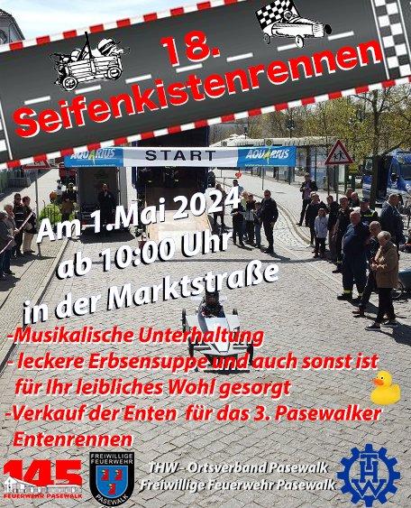 18. Seifenkistenrennen Am 01.Mai 2024 ab 10.00 Uhr in der Marktstraße Musikalische Unterhaltung leckere Erbsensuppe und auch sonst ist für Ihr leibliches Wohl gesorgt Verkauf der Enten für das 3. Pasewalker Entenrennen Eventdatum: Mittwoch, 01. Mai 2024 10:00 – 15:00 Eventort: Pasewalk Firmenkontakt und Herausgeber der Eventbeschreibung: Stadt PasewalkAm Markt 1217309 PasewalkTelefon: +49 (3973) 2510Telefax:…Continue reading 18. Seifenkistenrennen (Unterhaltung / Freizeit | Pasewalk)