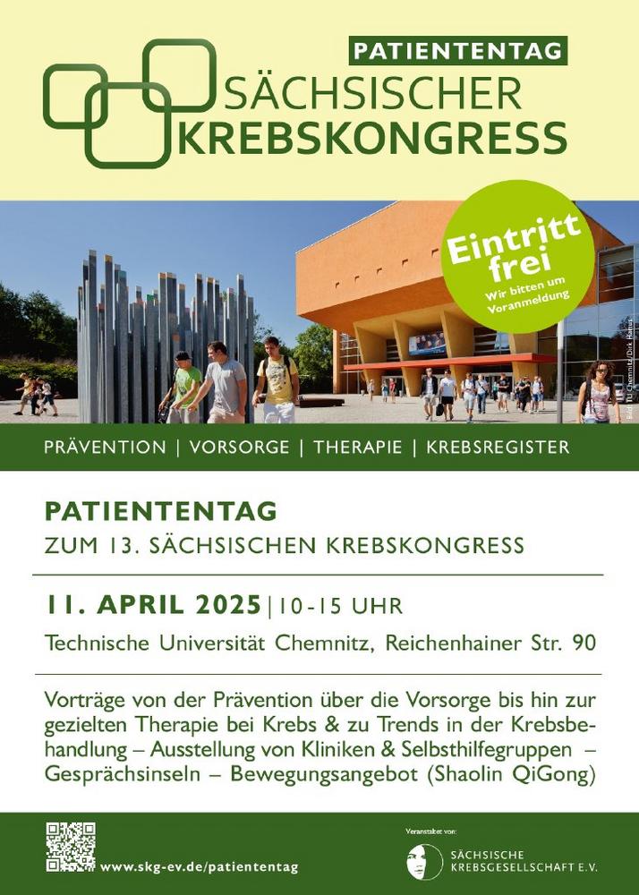 Sehr geehrte Patientinnen und Patienten, liebe Angehörige und Interessierte, wir laden Sie herzlich ein, am 11. April 2025 am Patiententag im Rahmen des 13. Sächsischen Krebskongresses teilzunehmen. Im Fokus stehen aktuelle Entwicklungen in der Behandlung von Krebserkrankungen. Nutzen Sie die Gelegenheit, sich umfassend zu informieren, Experten zu begegnen und Antworten auf Ihre Fragen zu erhalten.…Continue reading Patiententag zum Sächsischen Krebskongress (Vortrag | Chemnitz)
