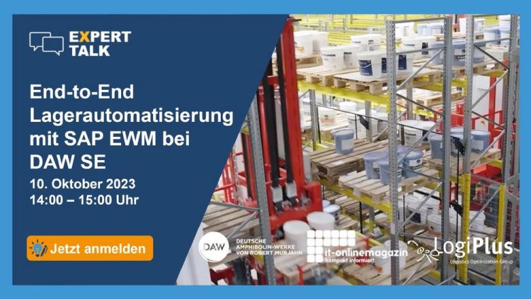 Im Expert-Talk des IT-Onlinemagazins geht es um die ganzheitliche Automatisierung der Intralogistik mit SAP-Lösungen bei der DAW SE, Europas größter privater Hersteller von Baufarben und Wärmedämmung. Am 10. Oktober beantworten Jörg Martin, Leiter Fertigwarenlager bei der DAW, und LogiPlus CEO Thilo Matheis die Fragen von Helge Sanden und Maike Rose vom IT-Onlinemagazin. Sie sprechen unter…Continue reading Expert-Talk: End-to-End Lagerautomatisierung mit SAP EWM bei DAW SE (Konferenz | Online)