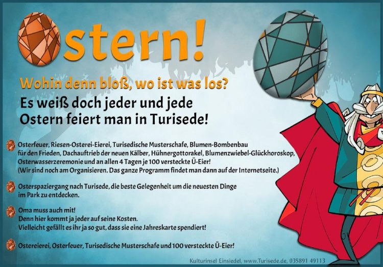 Ostern! Wohin denn blos, wo ist was los? Es weiß doch jeder und jede – Ostern feiert man in Turisede! Osterfeuer, Riesen-Osterei-Eierei, Turisedische Musterschafe, Blumen-Bombenbau für den Frieden, Dachauftrieb der neuen Kelber, Hühnergottorakel, Blumenzwiebel-Glückhoroskop, Osterwasserzeremonie, und an allen 4 Tagen je 100 versteckte Ü-Eier! (wir sind noch am Organisieren, das ganze Programm findet…Continue reading Osterorakeln in der Geheimen Welt von Turisede (Unterhaltung / Freizeit | Neißeaue)