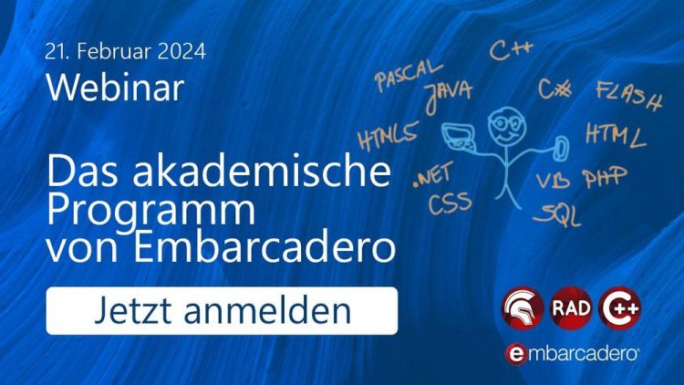 Wir laden Sie herzlich zu einem Webinar am 21. Februar 2024 ein, in dem wir Ihnen das Academische Programm von Embarcadero vorstellen und Ihnen zeigen, wie es in Bildungseinrichtungen eingesetzt werden kann. RAD Studio, die Suite für Delphi und C++Builder, ist für Schulen, Universitäten und Weiterbildungseinrichtungen kostenlos. Darüber hinaus haben wir in den letzten Jahren…Continue reading Webinar: Das akademische Programm von Embarcadero (Webinar | Online)