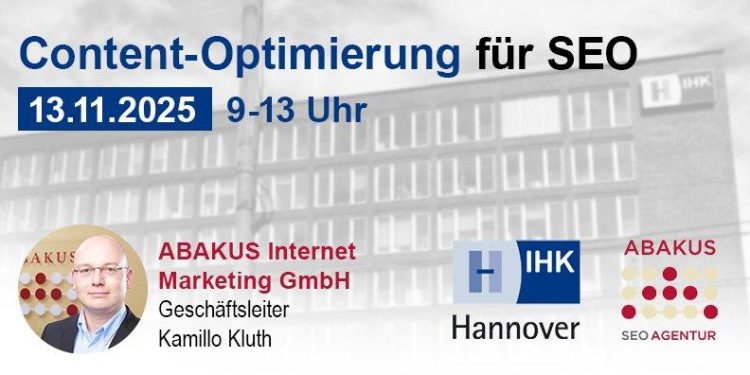 Am 13. November 2025 bietet die IHK Hannover erneut ein Halbtagesseminar zur Content-Optimierung für SEO an, ideal für alle, die Inhalte strategisch für Suchmaschinen und Nutzer gleichermaßen aufbereiten möchten. Referent:Kamillo Kluth, Geschäftsleiter von ABAKUS Internet Marketing, vermittelt in diesem Workshop tiefere Einblicke in die Entwicklung leistungsstarker Inhalte für Websites, Onlineshops und Blogs. Das Seminar baut…Continue reading IHK Hannover Seminar am 13.11.2025 – Content-Optimierung für SEO (Seminar | Hannover)